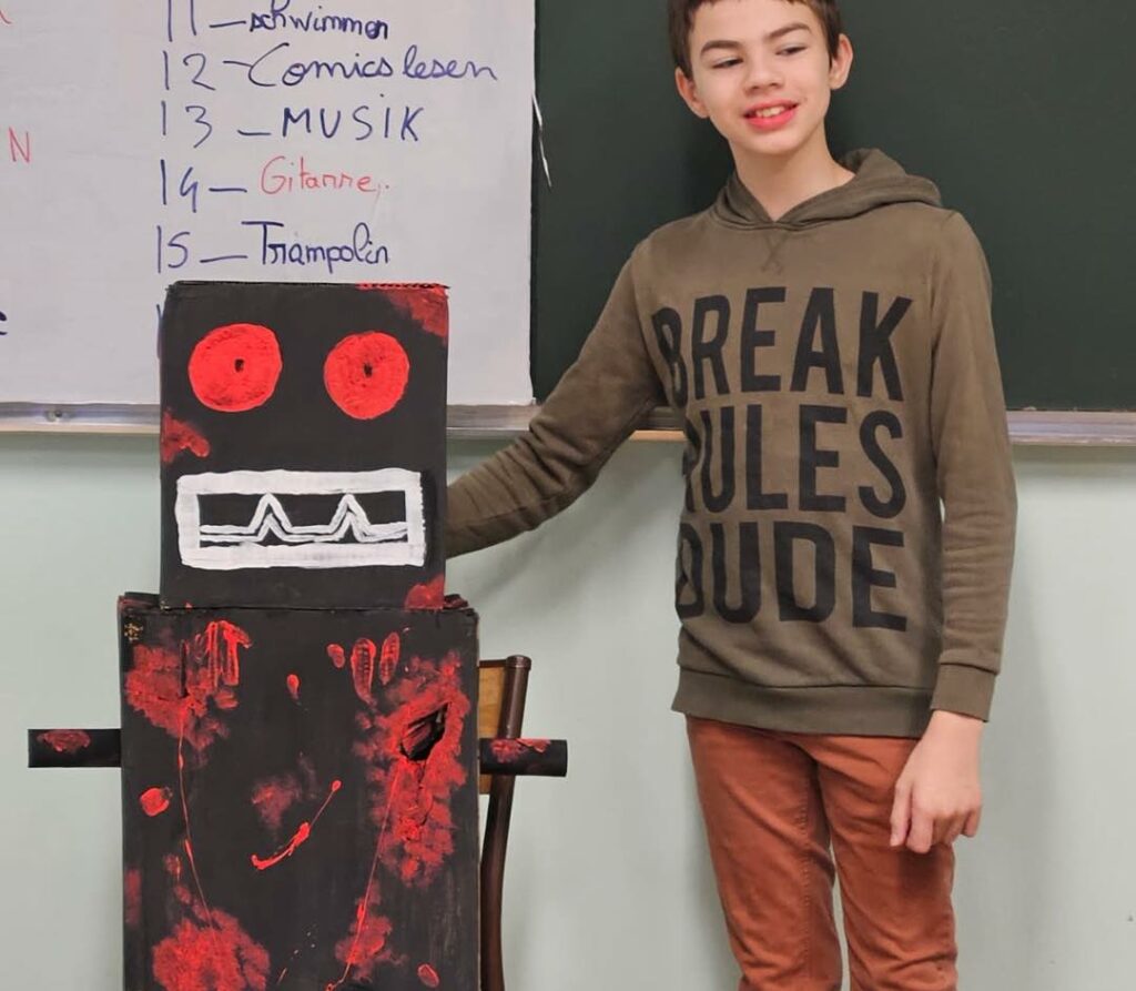Le lendemain, Caelan a surpris sa classe en apportant un robot qui parle déjà très bien allemand. Bravo à lui pour cette création et le bon moment offert en classe d’allemand